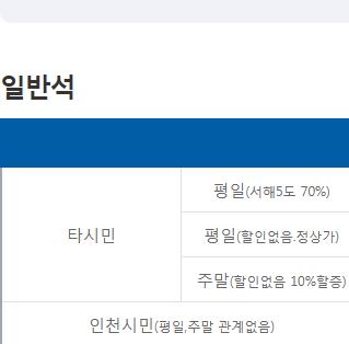 백령도ㆍ대청도ㆍ소청도 항로 평일 요금 기준(주말, 성수기, 공휴일 10% 할증요금 적용 / 유류할증료 별도), 단위(원) 백령도ㆍ대청도ㆍ소청도 항로 평일 요금 기준입니다 선명 항로 구분 일반요